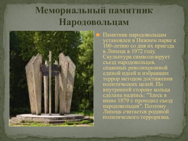 дня их приезда в Липецк в 1972 году. Скульптура символизирует съезд народовольцев, спаянных революционной единой идеей и избравших террор методом достижения политических целей. По внутренней стороне кольца сделана надпись: "Здесь в июне 1879 г. проходил съезд народовольцев". Поэтому Липецк считается родиной политического терроризма.