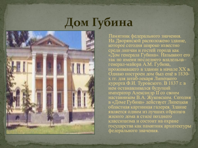 расположено здание, которое сегодня широко известно среди липчан и гостей города как «Дом генерала Губина». Называют его так по имени последнего владельца– генерал-майора А.М. Губина, проживавшего в здании в начале XX в. Однако построен дом был ещё в 1830-х гг. для штаб-лекаря Липецкого курорта Ф.И. Туровского. В 1837 г. в нем останавливался будущий император Александр II со своим наставником В.А. Жуковским. Сегодня в «Доме Губина» действует Липецкая областная картинная галерея. Здание является одним из лучших образцов жилого дома в стиле позднего классицизма и состоит на охране государства как памятник архитектуры федерального значения.