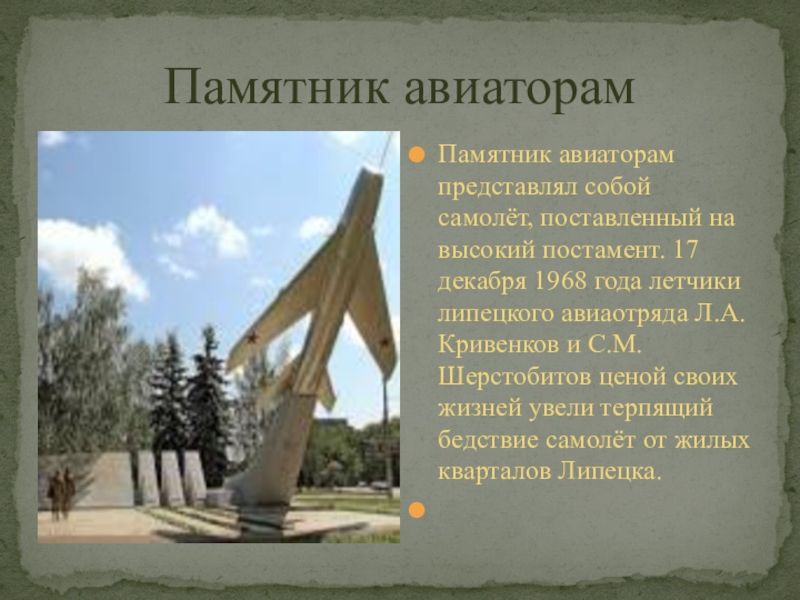 Памятник авиаторам представлял собой самолёт, поставленный на высокий постамент. 17
