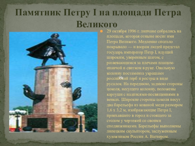 липчане собрались на площади, которая отныне носит имя Петра Великого. Медленно сползло покрывало — и взорам людей предстал государь император Петр I, идущий широким, уверенным шагом, с развевающимся за плечами плащом-епанчой и свитком в руке. Овальную колонну постамента украшают российский герб и ростры в виде русалок. На переднюю, заднюю стороны цоколя, несущего колонну, положены картуши с надписями-посвящениями в венках. Широкие стороны цоколя несут два барельефа из кованой меди размером 1,6 х 3,2 м, изображающие Петра I, приехавшего в город и стоящего за столом у чертежей со своими сподвижниками. Барельефы выполнены липецким скульптором, заслуженным художником России А. Вагнером.