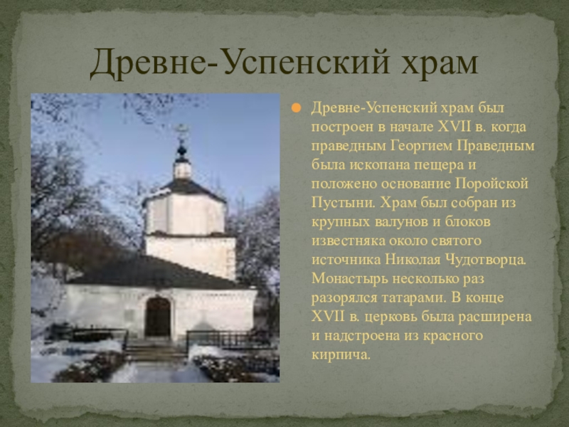 Древне-Успенский храм был построен в начале XVII в. когда праведным