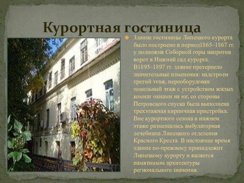 подножия Соборной горы напротив ворот в Нижний сад курорта. В1895–1897 гг. здание претерпело значительные изменения: надстроен третий этаж, переоборудован цокольный этаж с устройством жилых комнат окнами на юг, со стороны Петровского спуска была выполнена трехэтажная кирпичная пристройка. Вне курортного сезона в нижнем этаже размещалась амбулаторная лечебница Липецкого отделения Красного Креста. В настоящее время здание по-прежнему принадлежит Липецкому курорту и является памятником архитектуры регионального значения.
