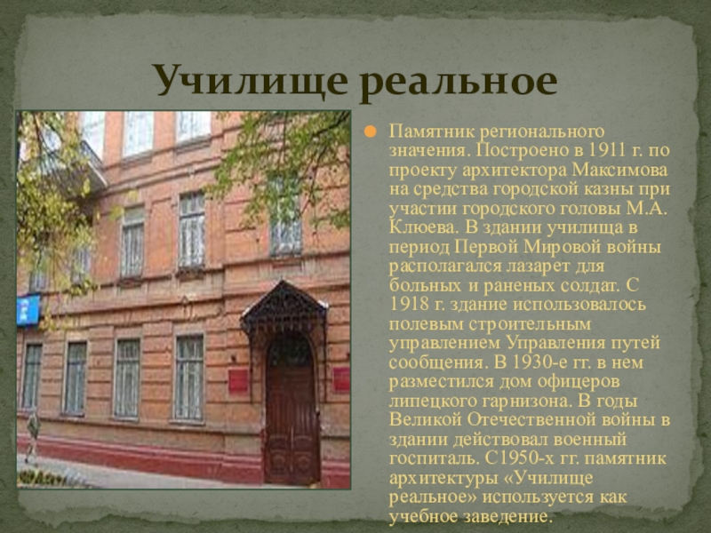Максимова на средства городской казны при участии городского головы М.А. Клюева. В здании училища в период Первой Мировой войны располагался лазарет для больных и раненых солдат. С 1918 г. здание использовалось полевым строительным управлением Управления путей сообщения. В 1930-е гг. в нем разместился дом офицеров липецкого гарнизона. В годы Великой Отечественной войны в здании действовал военный госпиталь. С1950-х гг. памятник архитектуры «Училище реальное» используется как учебное заведение.