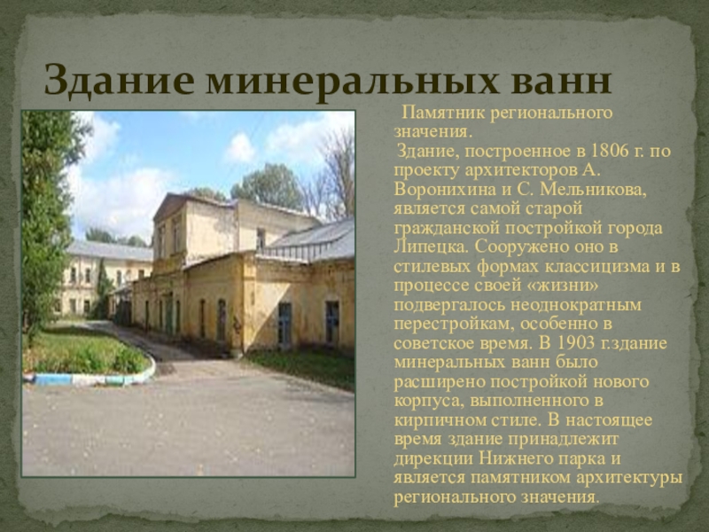 построенное в 1806 г. по проекту архитекторов А.Воронихина и С. Мельникова, является самой старой гражданской постройкой города Липецка. Сооружено оно в стилевых формах классицизма и в процессе своей «жизни»подвергалось неоднократным перестройкам, особенно в советское время. В 1903 г.здание минеральных ванн было расширено постройкой нового корпуса, выполненного в кирпичном стиле. В настоящее время здание принадлежит дирекции Нижнего парка и является памятником архитектуры регионального значения.