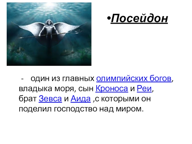 - один из главных олимпийских богов, владыка моря, сын Кроноса и Реи, брат Зевса и Аида ,с которыми он