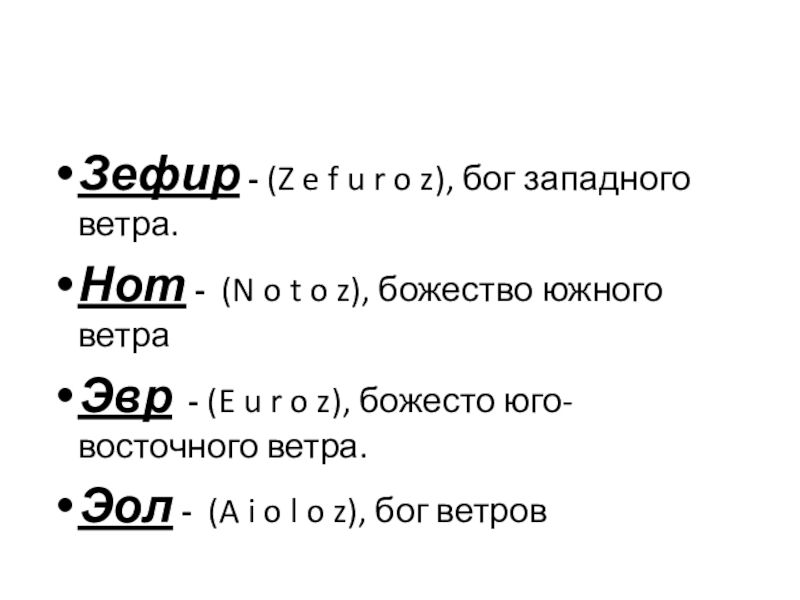 Зефир - (Z e f u r o z), бог западного ветра. Нот -  (N o t o z),