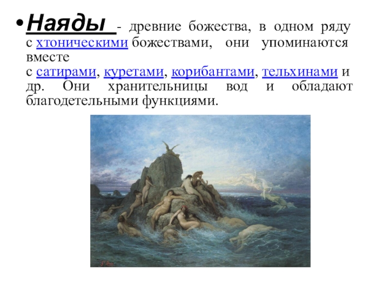 Слайд 9Наяды - древние божества, в одном ряду с хтоническими божествами, они упоминаются вместе