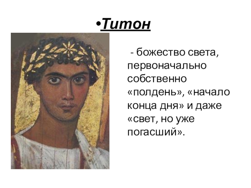 Титон	- божество света, первоначально собственно «полдень», «начало конца дня» и даже «свет, но уже погасший».