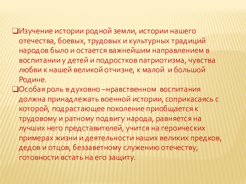 Слайд 16Изучение истории родной земли, истории нашего отечества, боевых, трудовых и культурных
