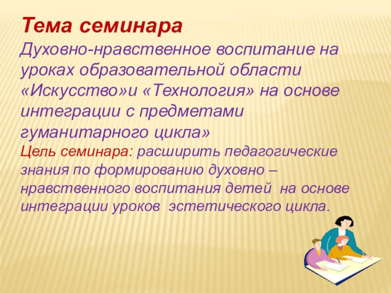 Цель семинара: расширить педагогические знания по формированию духовно –нравственного воспитания детей на основе интеграции уроков эстетического цикла.