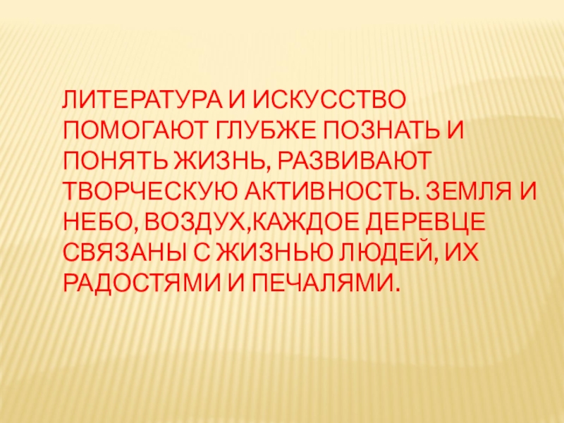 Слайд 30ЛИТЕРАТУРА И ИСКУССТВО ПОМОГАЮТ ГЛУБЖЕ ПОЗНАТЬ И ПОНЯТЬ ЖИЗНЬ, РАЗВИВАЮТ ТВОРЧЕСКУЮ