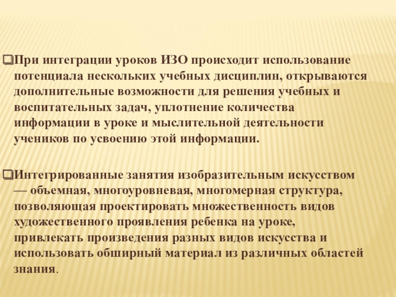 Интегрированные занятия изобразительным искусством — объемная, многоуровневая, многомерная структура, позволяющая проектировать множественность видов художественного проявления ребенка на уроке, привлекать произведения разных видов искусства и использовать обширный материал из различных областей знания.