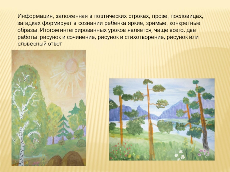 ребенка яркие, зримые, конкретные образы. Итогом интегрированных уроков является, чаще всего, две работы: рисунок и сочинение, рисунок и стихотворение, рисунок или словесный ответ
