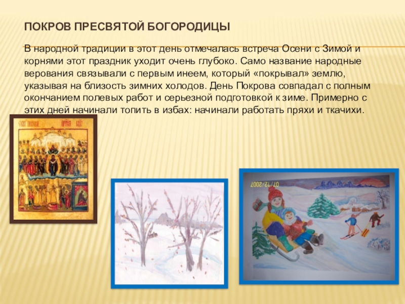 с Зимой и корнями этот праздник уходит очень глубоко. Само название народные верования связывали с первым инеем, который «покрывал» землю, указывая на близость зимних холодов. День Покрова совпадал с полным окончанием полевых работ и серьезной подготовкой к зиме. Примерно с этих дней начинали топить в избах: начинали работать пряхи и ткачихи.