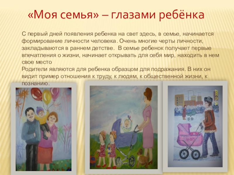 свет здесь, в семье, начинается формирование личности человека. Очень многие черты личности, закладываются в раннем детстве. В семье ребенок получает первые впечатления о жизни, начинает открывать для себя мир, находить в нем свое место