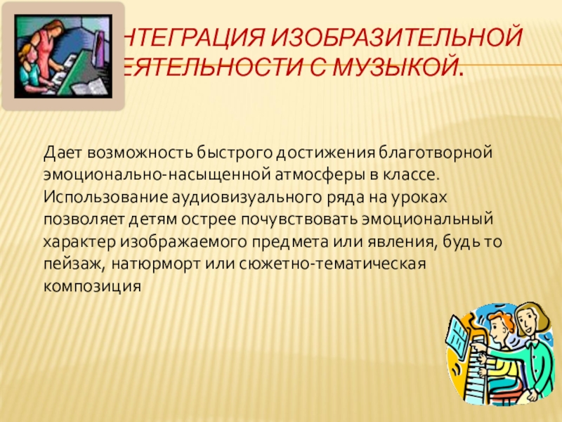в классе. Использование аудиовизуального ряда на уроках позволяет детям острее почувствовать эмоциональный характер изображаемого предмета или явления, будь то пейзаж, натюрморт или сюжетно-тематическая композиция