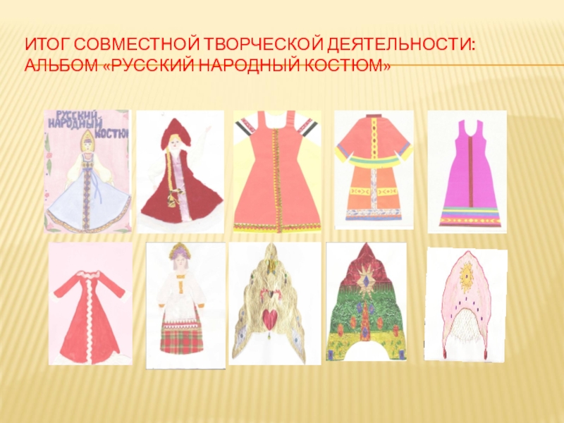 Слайд 13ИТОГ СОВМЕСТНОЙ ТВОРЧЕСКОЙ ДЕЯТЕЛЬНОСТИ: АЛЬБОМ «РУССКИЙ НАРОДНЫЙ КОСТЮМ»