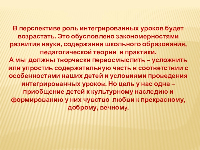 Слайд 36В перспективе роль интегрированных уроков будет возрастать. Это обусловлено закономерностями развития