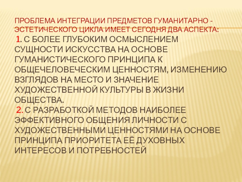 Слайд 8ПРОБЛЕМА ИНТЕГРАЦИИ ПРЕДМЕТОВ ГУМАНИТАРНО - ЭСТЕТИЧЕСКОГО ЦИКЛА ИМЕЕТ СЕГОДНЯ ДВА АСПЕКТА: