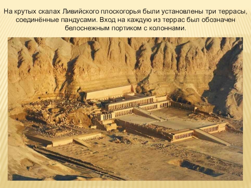 Слайд 17На крутых скалах Ливийского плоскогорья были установлены три террасы, соединённые пандусами.
