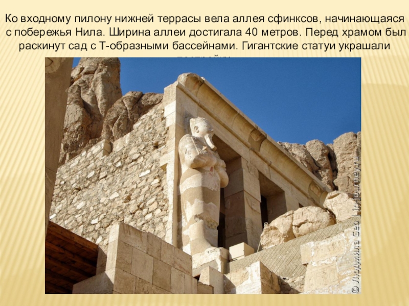 Нила. Ширина аллеи достигала 40 метров. Перед храмом был раскинут сад с Т-образными бассейнами. Гигантские статуи украшали постройку.