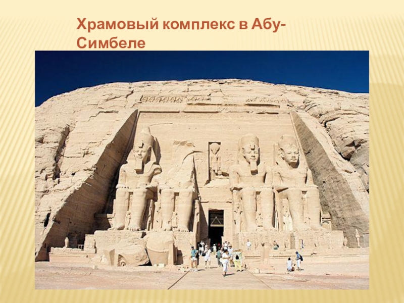 до н. э. Постройка относится к типу скальных храмов. На входном фасаде выставлены гигантские статуи покровительствующих фараону богов: Амона, Ра и Птаха. Рядом с ними соседствует сам фараон в сидячей позе. Интересно, что фараон придал свой облик всем трём богам. Рядом с ним сидит его жена – Нефертари вместе с детьми.