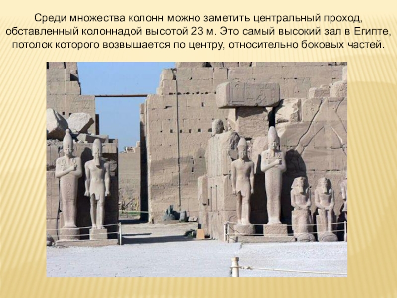 Слайд 8Среди множества колонн можно заметить центральный проход, обставленный колоннадой высотой 23