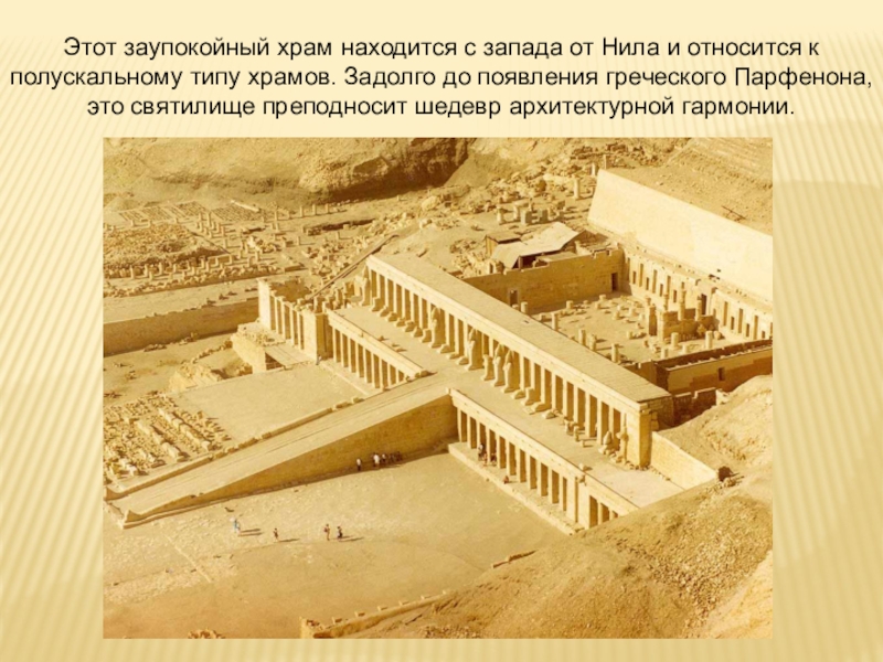 Слайд 16Этот заупокойный храм находится с запада от Нила и относится к