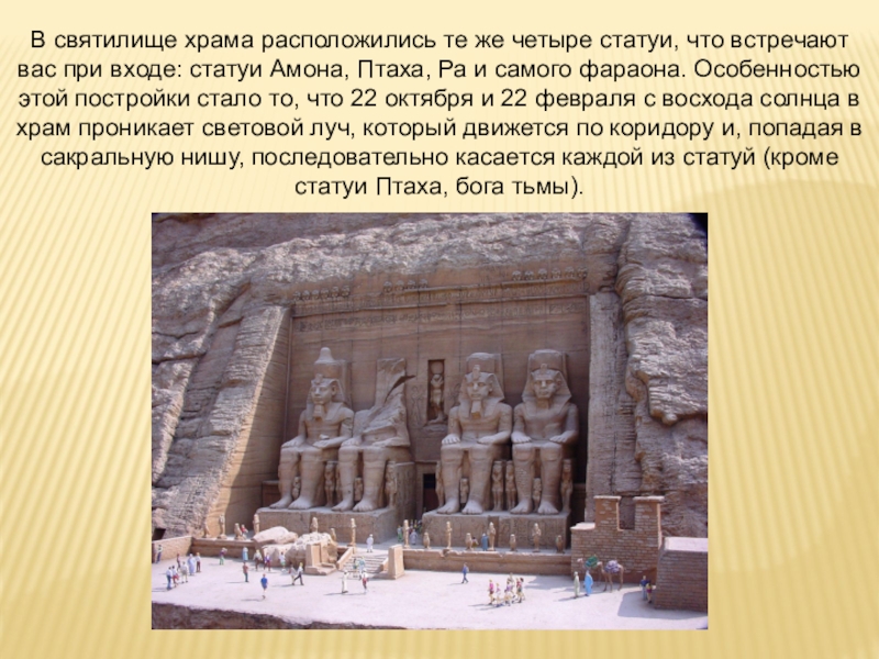 при входе: статуи Амона, Птаха, Ра и самого фараона. Особенностью этой постройки стало то, что 22 октября и 22 февраля с восхода солнца в храм проникает световой луч, который движется по коридору и, попадая в сакральную нишу, последовательно касается каждой из статуй (кроме статуи Птаха, бога тьмы).