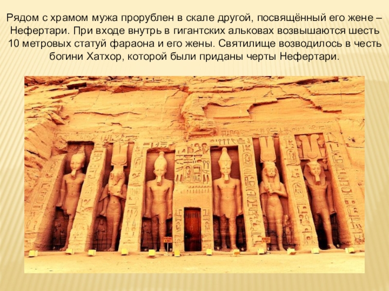 – Нефертари. При входе внутрь в гигантских альковах возвышаются шесть 10 метровых статуй фараона и его жены. Святилище возводилось в честь богини Хатхор, которой были приданы черты Нефертари.