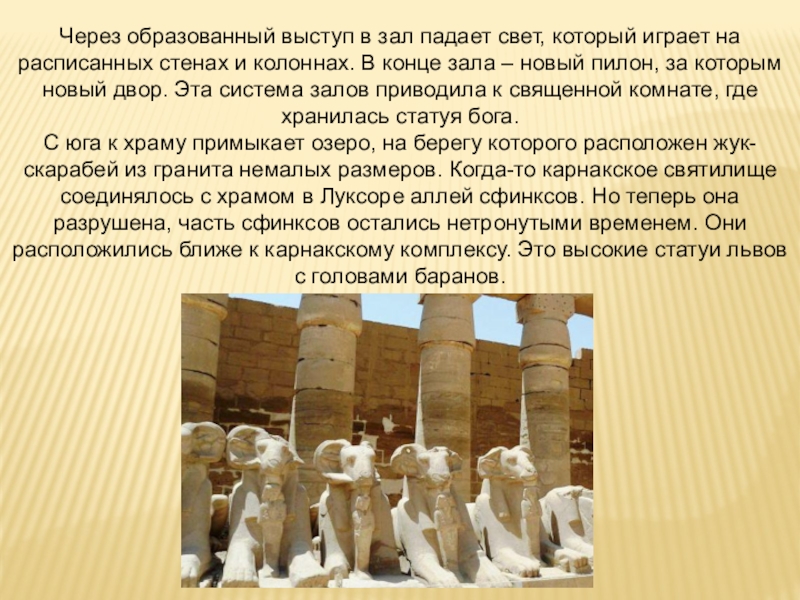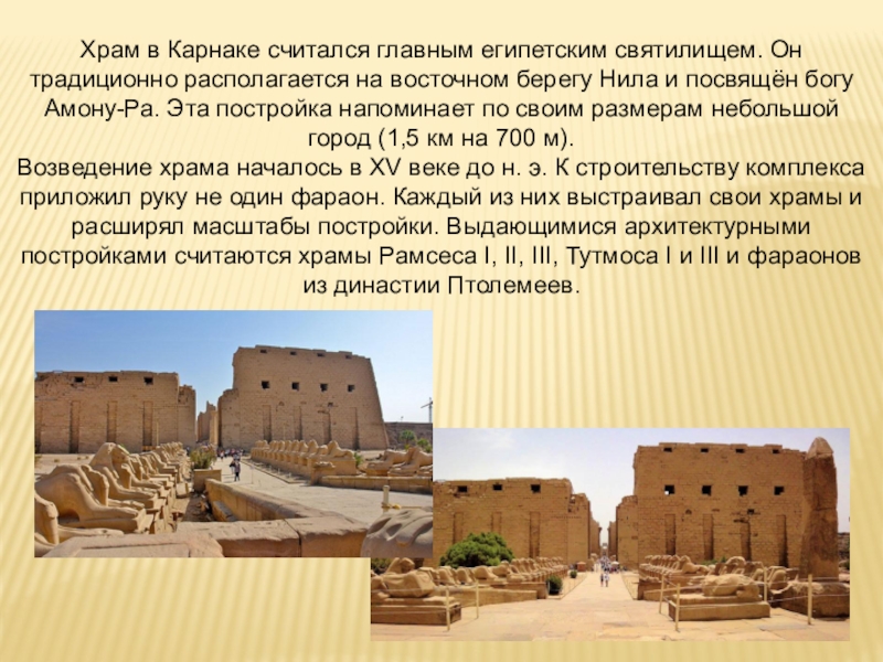 Слайд 6Храм в Карнаке считался главным египетским святилищем. Он традиционно располагается на