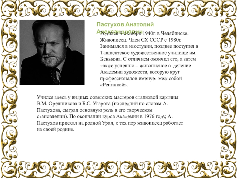 Учился здесь у видных советских мастеров станковой картины В.М. Орешникова и Б.С. Угарова (последний по словам А. Пастухова, сыграл основную роль в его творческом становлении). По окончании курса Академии в 1976 году, А. Пастухов приехал на родной Урал, с тех пор живописец работает на своей родине.
