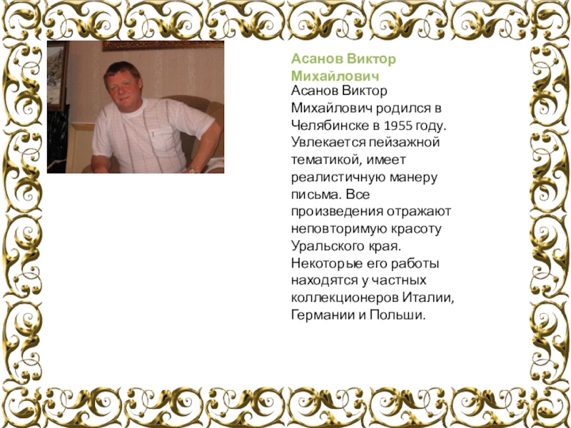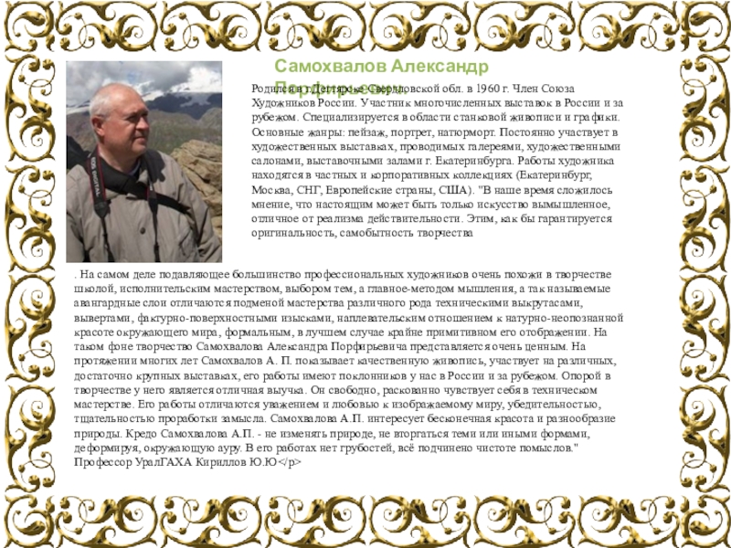 . На самом деле подавляющее большинство профессиональных художников очень похожи в творчестве школой, исполнительским мастерством, выбором тем, а главное-методом мышления, а так называемые авангардные слои отличаются подменой мастерства различного рода техническими выкрутасами, вывертами, фактурно-поверхностными изысками, наплевательским отношением к натурно-неопознанной красоте окружающего мира, формальным, в лучшем случае крайне примитивном его отображении. На таком фоне творчество Самохвалова Александра Порфирьевича представляется очень ценным. На протяжении многих лет Самохвалов А. П. показывает качественную живопись, участвует на различных, достаточно крупных выставках, его работы имеют поклонников у нас в России и за рубежом. Опорой в творчестве у него является отличная выучка. Он свободно, раскованно чувствует себя в техническом мастерстве. Его работы отличаются уважением и любовью к изображаемому миру, убедительностью, тщательностью проработки замысла. Самохвалова А.П. интересует бесконечная красота и разнообразие природы. Кредо Самохвалова А.П. - не изменять природе, не вторгаться теми или иными формами, деформируя, окружающую ауру. В его работах нет грубостей, всё подчинено чистоте помыслов." Профессор УралГАХА Кириллов Ю.Ю