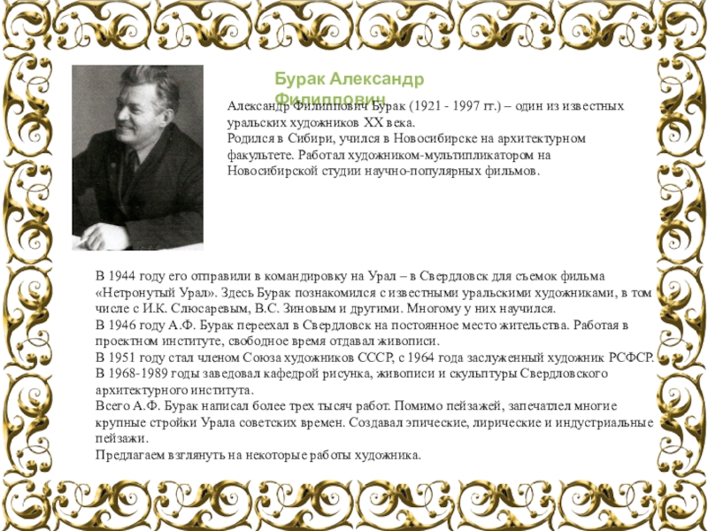 В 1944 году его отправили в командировку на Урал – в Свердловск для съемок фильма «Нетронутый Урал». Здесь Бурак познакомился с известными уральскими художниками, в том числе с И.К. Слюсаревым, В.С. Зиновым и другими. Многому у них научился.