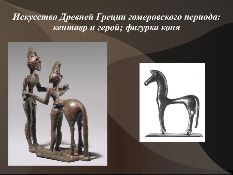 Слайд 5Искусство Древней Греции гомеровского периода: кентавр и герой; фигурка коня