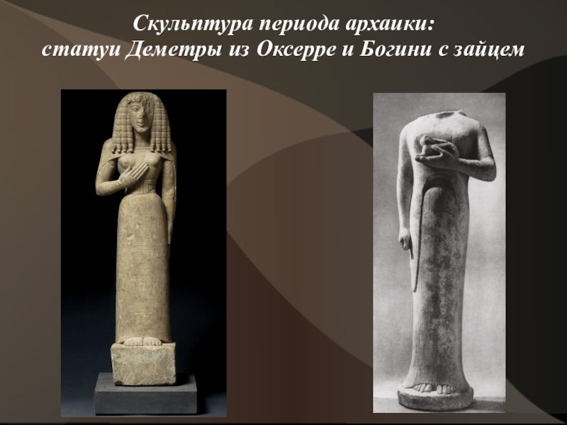 Слайд 17Скульптура периода архаики: статуи Деметры из Оксерре и Богини с зайцем