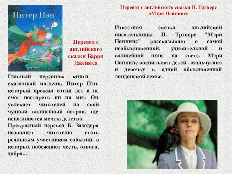 Главный персонаж книги - сказочный мальчик Питер Пэн, который прожил сотни лет и не смог постареть ни на миг. Он увлекает читателей на свой чудный волшебный остров, где исполняются мечты детства.