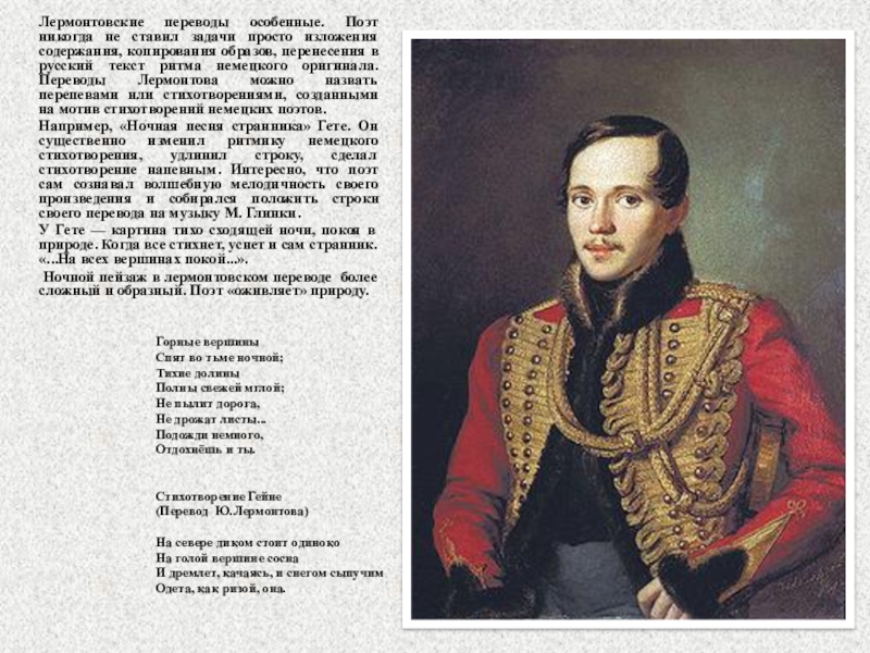 Лермонтовские переводы особенные. Поэт никогда не ставил задачи просто изложения содержания, копирования образов, перенесения в русский текст ритма немецкого оригинала. Переводы Лермонтова можно назвать перепевами или стихотворениями, созданными на мотив стихотворений немецких поэтов.