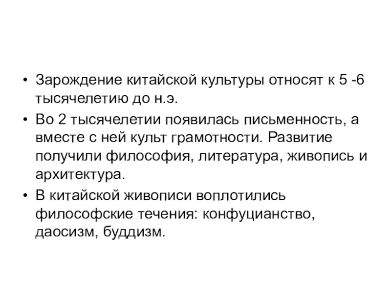 Зарождение китайской культуры относят к 5 -6 тысячелетию до н.э.Во 2 тысячелетии появилась письменность, а вместе с ней культ грамотности. Развитие получили философия, литература, живопись и архитектура.В китайской живописи воплотились философские течения: конфуцианство, даосизм, буддизм.