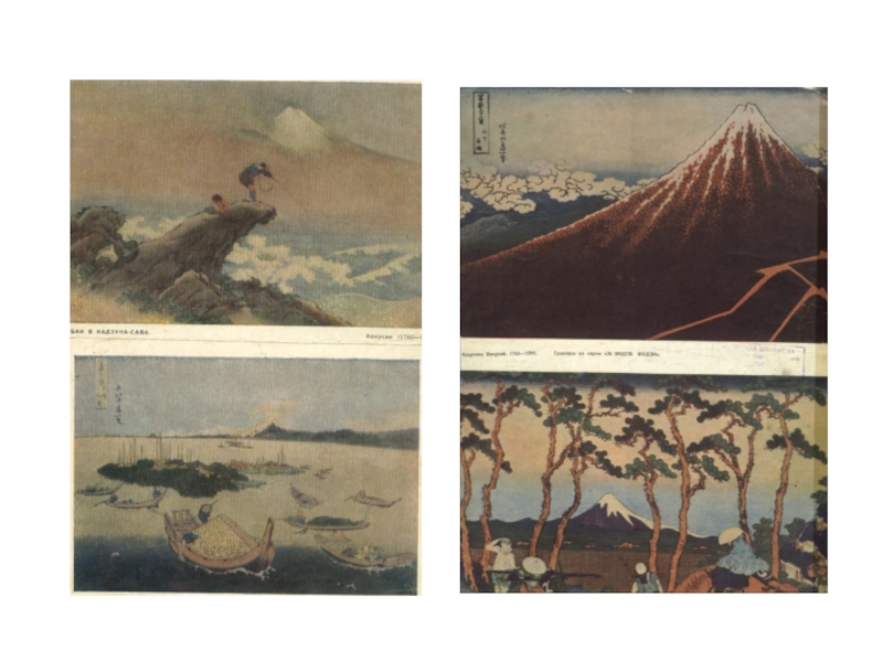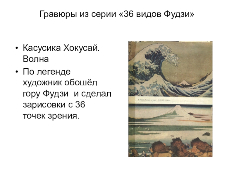 Гравюры из серии «36 видов Фудзи»Касусика Хокусай. Волна По легенде художник обошёл гору Фудзи и сделал зарисовки