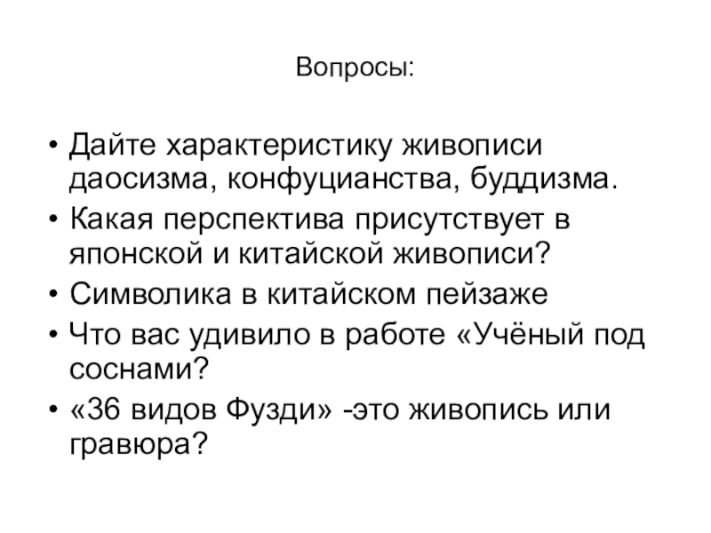 Вопросы:Дайте характеристику живописи даосизма, конфуцианства, буддизма.Какая перспектива присутствует в японской и китайской живописи?Символика в китайском пейзаже Что