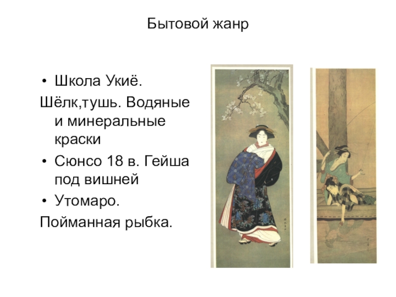 Бытовой жанрШкола Укиё.Шёлк,тушь. Водяные и минеральные краскиСюнсо 18 в. Гейша под вишнейУтомаро. Пойманная рыбка.