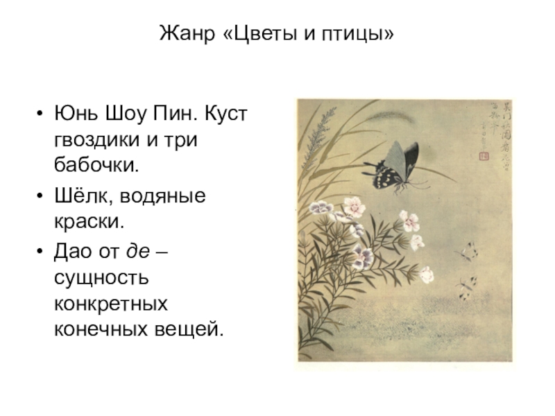 Жанр «Цветы и птицы»Юнь Шоу Пин. Куст гвоздики и три бабочки. Шёлк, водяные краски.Дао от де –