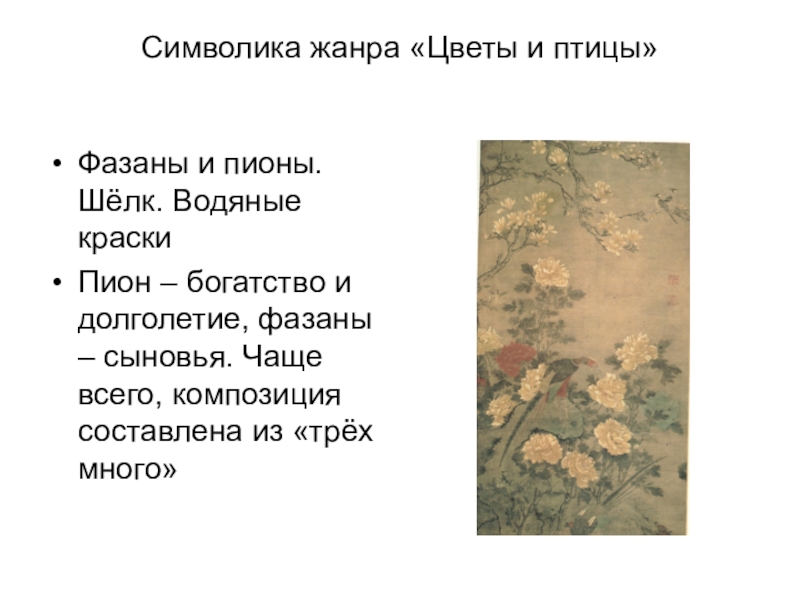 Символика жанра «Цветы и птицы»Фазаны и пионы. Шёлк. Водяные краскиПион – богатство и долголетие, фазаны – сыновья.