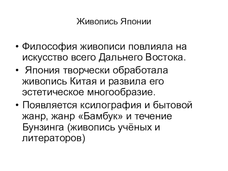 Живопись ЯпонииФилософия живописи повлияла на искусство всего Дальнего Востока. Япония творчески обработала живопись Китая и развила его
