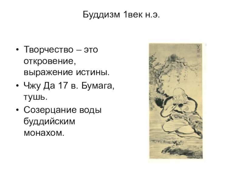 Буддизм 1век н.э.Творчество – это откровение, выражение истины.Чжу Да 17 в. Бумага, тушь. Созерцание воды буддийским монахом.