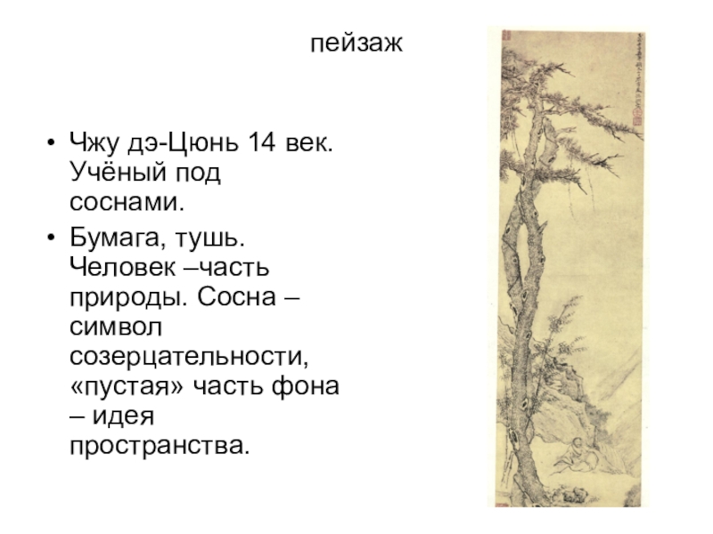 пейзажЧжу дэ-Цюнь 14 век. Учёный под соснами. Бумага, тушь. Человек –часть природы. Сосна –символ созерцательности, «пустая» часть