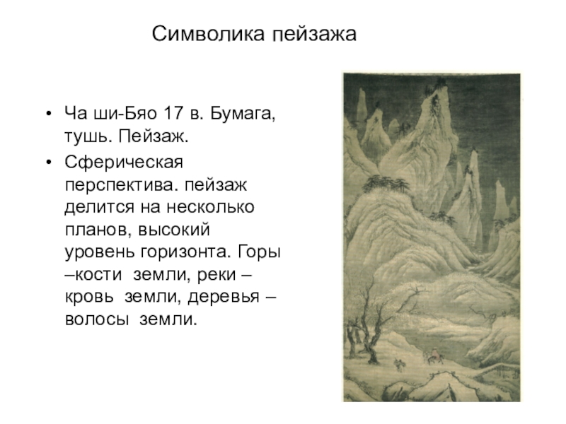 Символика пейзажаЧа ши-Бяо 17 в. Бумага, тушь. Пейзаж.Сферическая перспектива. пейзаж делится на несколько планов, высокий уровень горизонта.