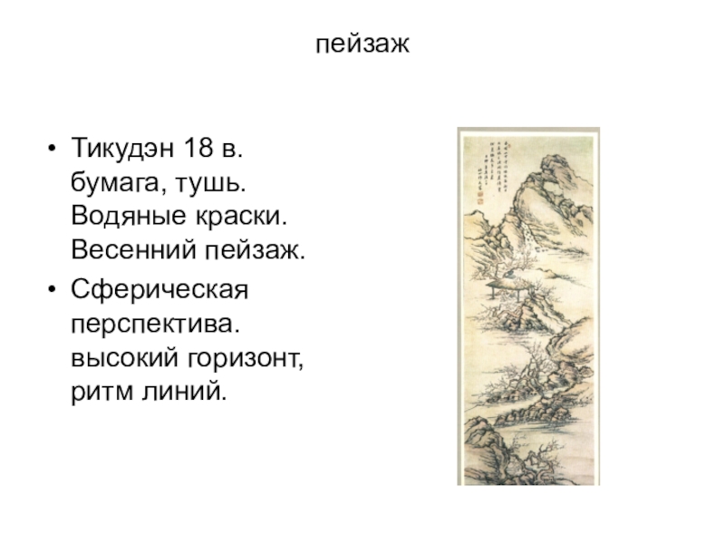 пейзажТикудэн 18 в. бумага, тушь. Водяные краски. Весенний пейзаж.Сферическая перспектива. высокий горизонт, ритм линий.