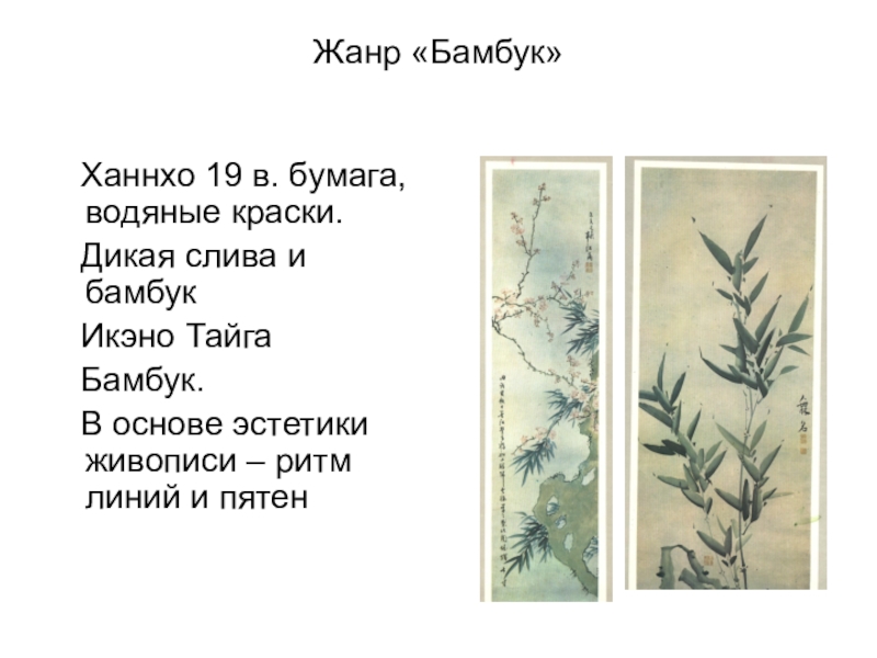 Жанр «Бамбук»  Ханнхо 19 в. бумага,водяные краски.  Дикая слива и бамбук  Икэно Тайга